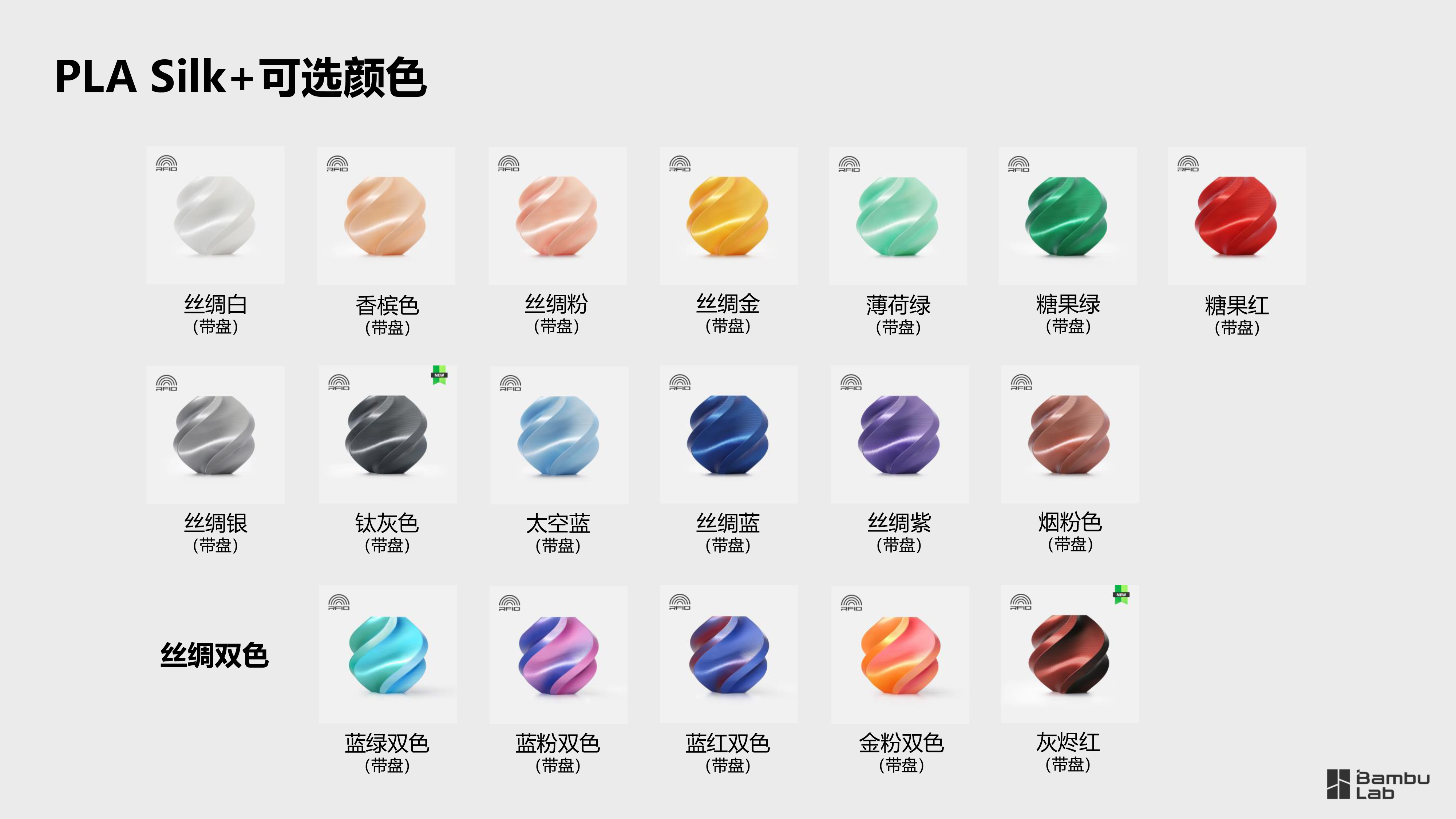 PLA Silk+丝绸光泽,韧性更强,多色混合。PLA Metal 金属打印模型具有金属质感,光泽可控,高韧性,抗冲击。PLA Matte哑光质感,高韧性,可高速打印。 PLA Glow 夜光能够在黑暗环境中释放荧光的耗材。